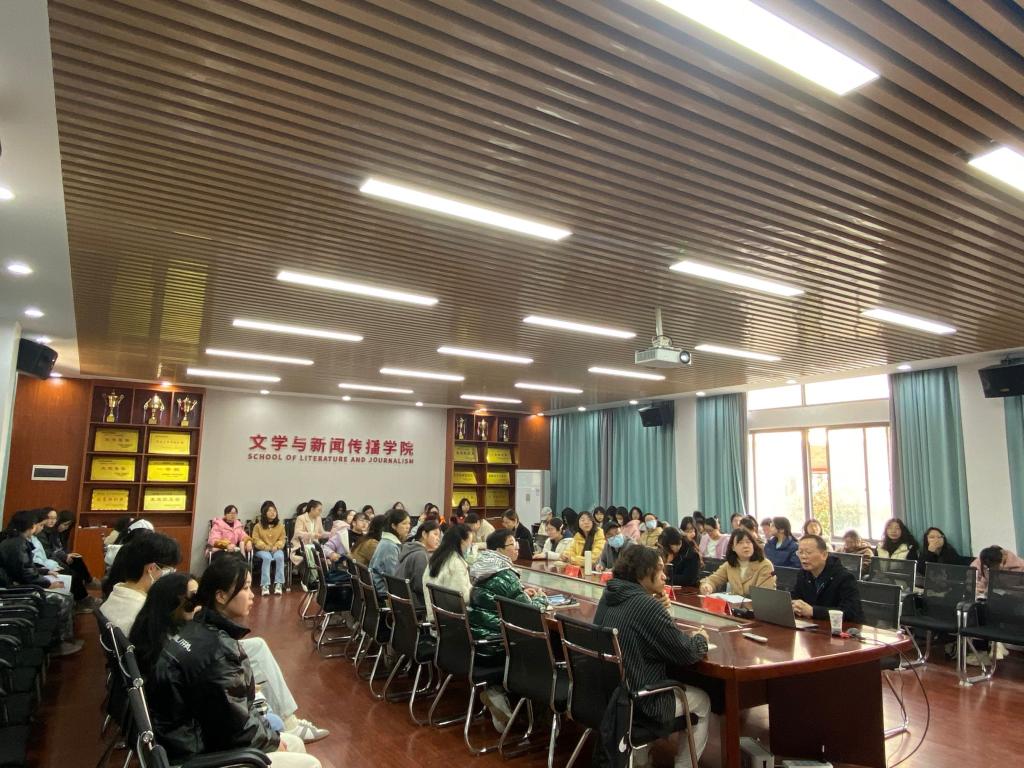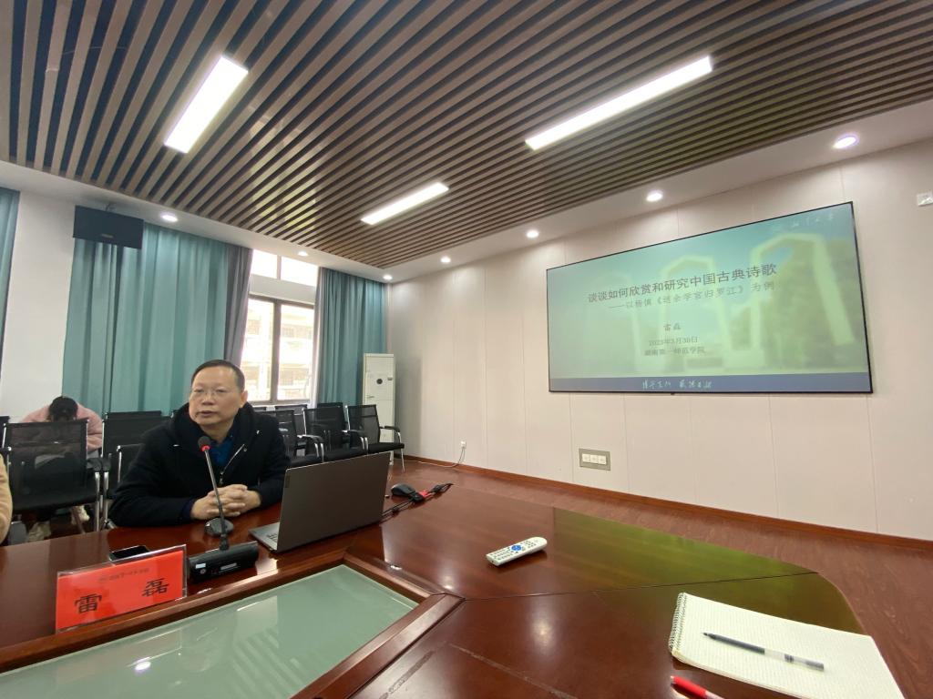 2023年3月30日上午,湘潭大学文学与新闻学院院长雷磊应邀为我院师生开展题为“谈谈如何欣赏和研究古典诗歌”的学术讲座。讲座由王霞副院长主持,我院近百名师生参加了本次讲座。