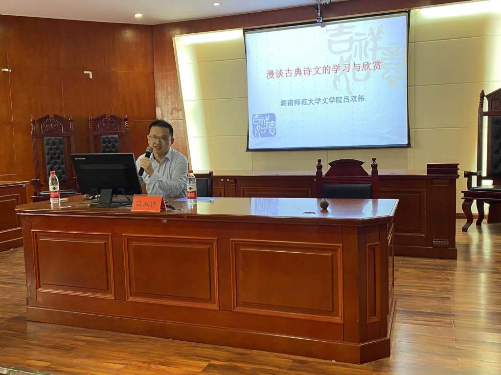 2022年10月20日下午,湖南师范大学文学院副院长、博士生导师吕双伟教授应邀在特立南112(模拟法庭)为我院师生开展主题为“漫谈古典诗文的学习与欣赏”的学术讲座。讲座由学院副院长王霞主持,汉语言文学专业学生100余人参加。