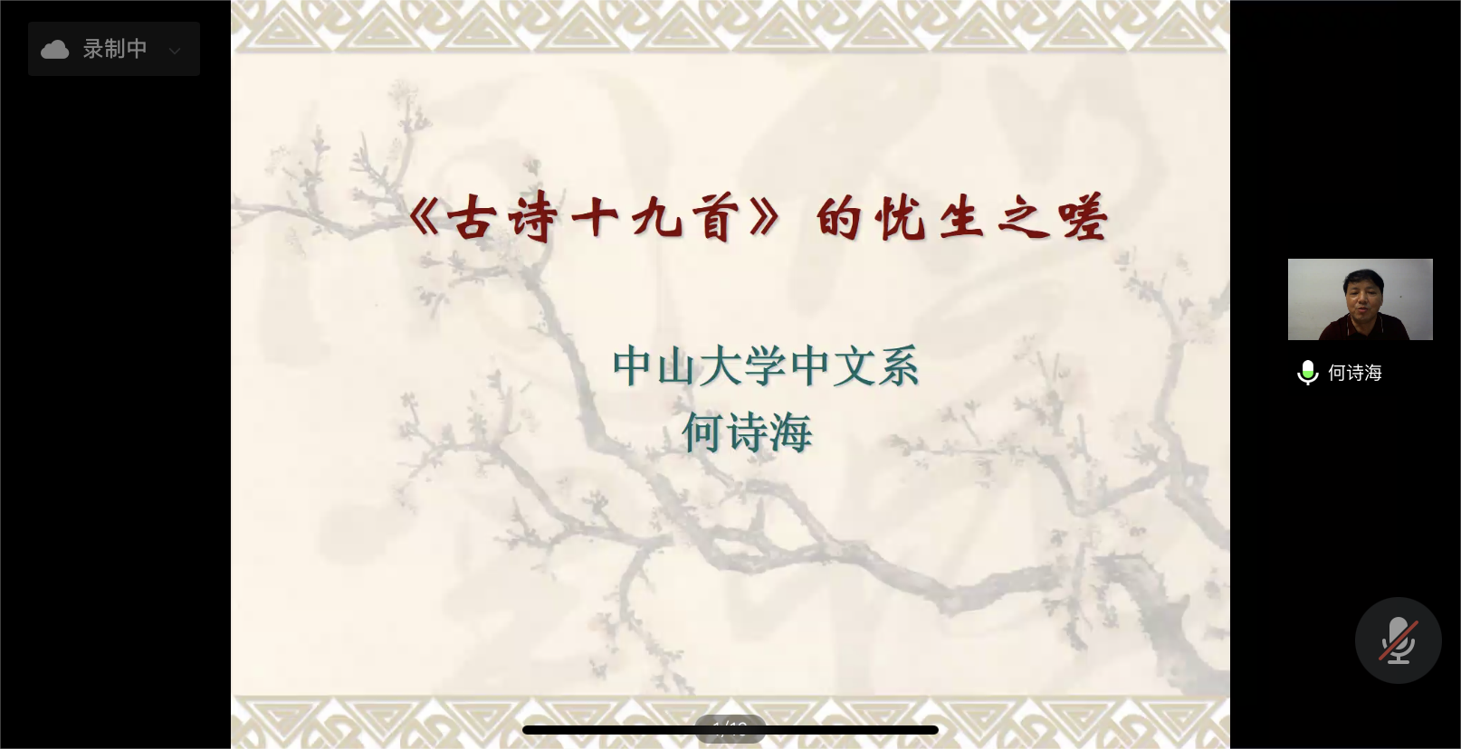 2022年6月6日晚,中山大学中文系教授、博士生导师何诗海应邀为我院师生进行了以“《古诗十九首》的忧生之嗟”为题的线上学术讲座。讲座由学院龙永干院长主持,汉语言文学系部分师生在线参加学习和讨论。