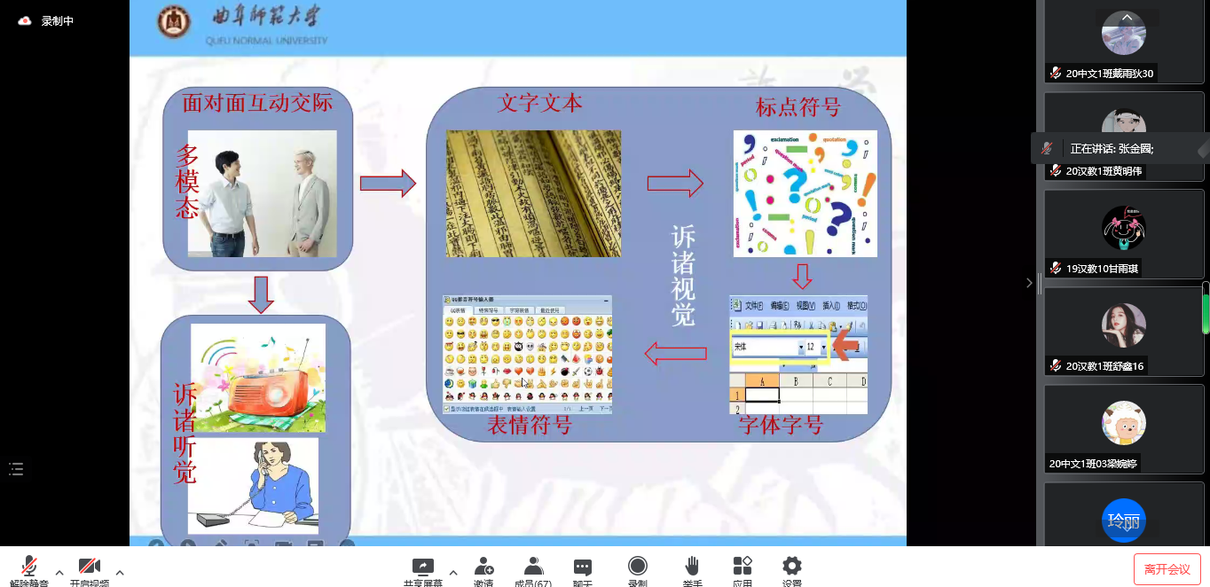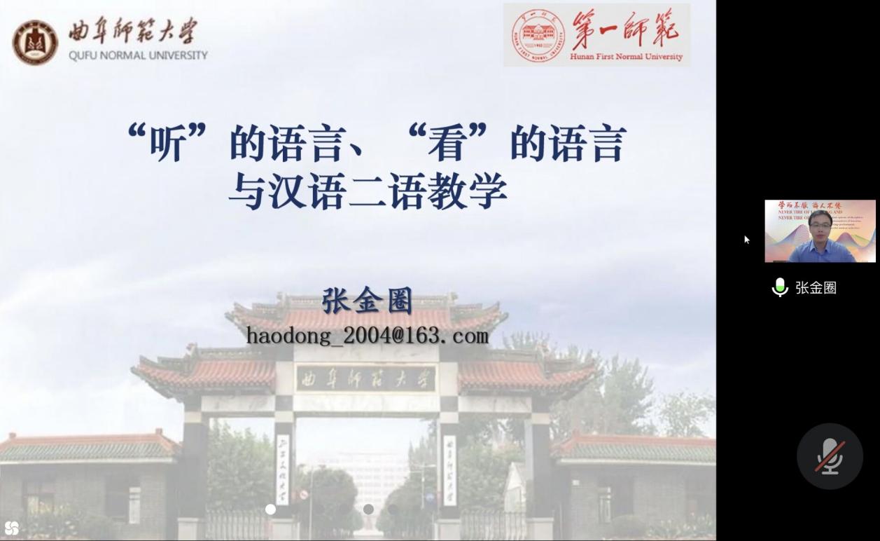 5月18日晚,曲阜师范大学张金圈教授应邀为我院师生作了线上学术讲座——“听”的语言、“看”的语言与汉语二语教学。讲座由王霞副院长主持,毛丽、孙雅萍、赵姣、刘晓云、谌鸽等老师及文传院60多位学生参加了此次讲座。