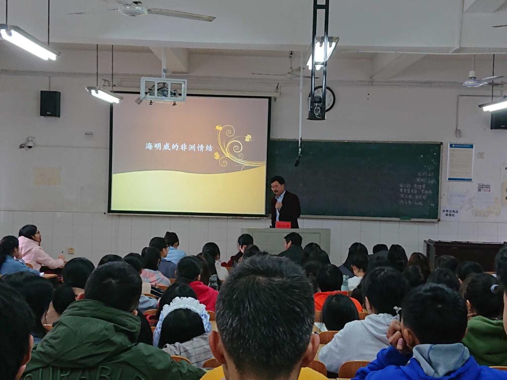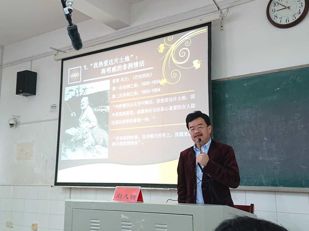 2018年11月30日上午,华中科技大学博士生导师、人文社科处处长刘久明教授应邀来我校为师生举行了题为“海明威的非洲情结”的学术讲座。讲座由AV中文字幕在线观看副院长龙永干教授主持。AV中文字幕在线观看比较文学与世界文学专业教师和各专业近200名学生聆听了本次讲座。