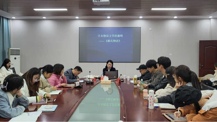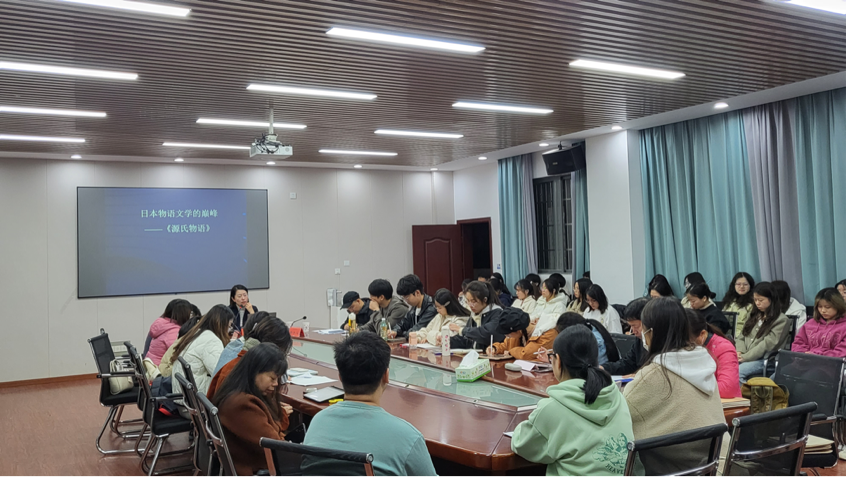 11月16日晚,湖南大学中国语言文学学院副院长、博士生导师刘舸教授受邀为我院师生开展题为“日本物语文学的巅峰——《源氏物语》”的学术讲座。讲座由院长龙永干主持,副院长杨水远及汉语言文学系师生近百人参加讲座。