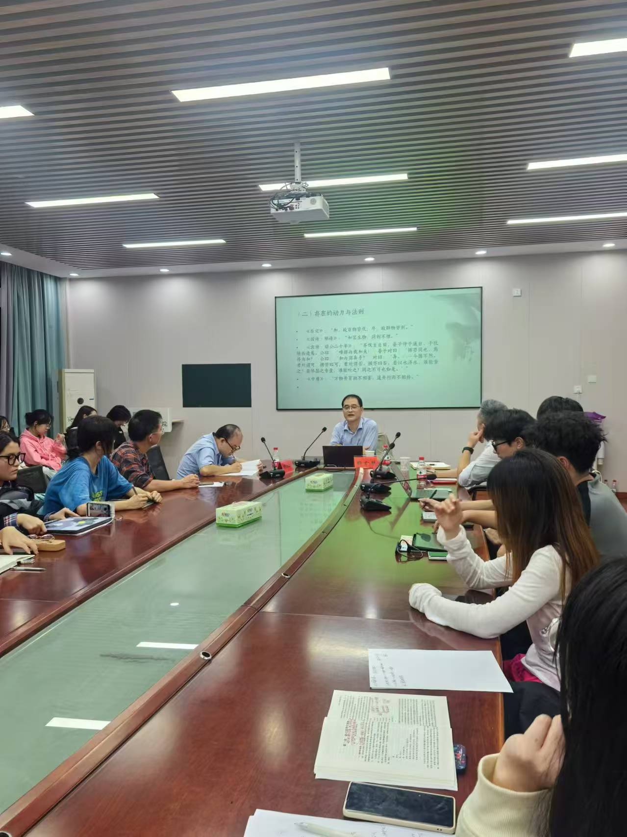 10月17日,湖南师范大学文学院杨合林教授应邀来我院开展题为“如乐之和:中华文明的精神与特征”的学术讲座。副院长杨水远、张惠,汉语言文学系卢阿涛主任、桂昕翔、童业富、周奕希、谭咏枚等老师以及23级中文6班、润之英才班全体学生等百余名师生参与讲座。讲座由副院长杨水远主持。学术报告伊始,杨合林教授以“乐”“乐学”的基本内涵解读为导引,指出“乐之和”最能体现中国文化的基本精神,是典型的中国智慧和中国经验。杨合林教授认为“道”生“和”,“和”生“乐”,知“乐”则知“和”,知“和”则知“道”,一步步地引导学生认识到“和”的本义及其延生到社会领域、政治领域以及理想世界的“和”的发展过程和具体含义。尤其是杨合林教授以实现大同社会和构建人类命运共同体为例展开论述,结合时代,使同学们更加深刻地理解“和”的基本含义和美学内涵。杨合林老师总结道“美各其美,美人之美,美美与共,天下大同”,我们的世界是一个多元的世界,要尊重和理解差异性,我们的社会才能成为一个更加和谐的社会,这也正是中华文明的基本特征和优势所在。在交流环节,同学们深度思考、踊跃发言,杨教授对同学们的疑惑一一予以解答。副院长杨水远认为杨合林教授的报告学术含量、信息含量极高,拥有阔大的学术境界,他认为杨合林教授所展示的学术路径,至少给我们三点启示,即做学问就要做最根本的、最本源性的、最扎实的学问,勉励同学们向杨合林教授学习。