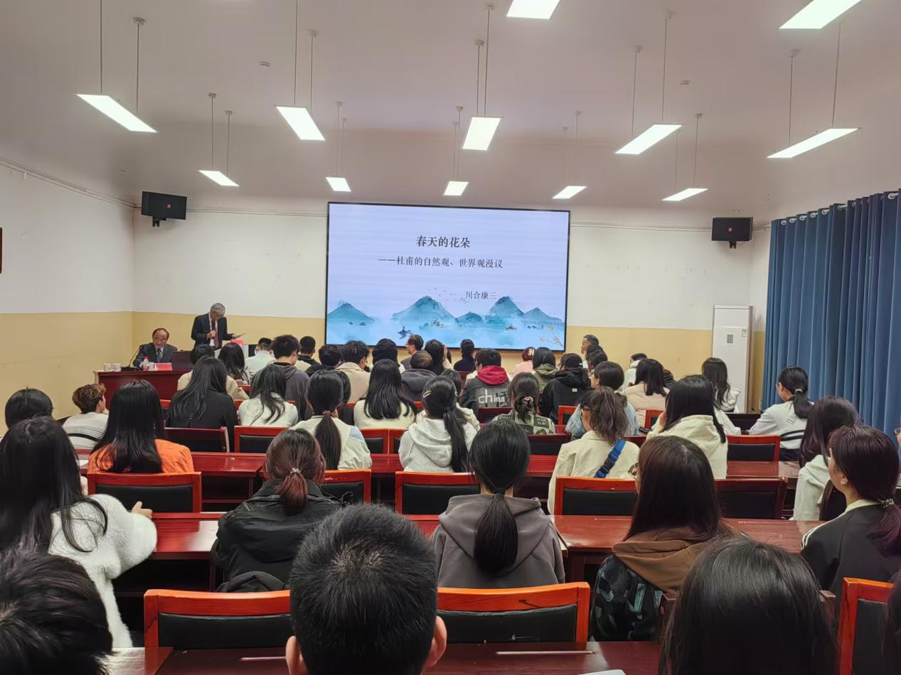11月17日,当代日本著名汉学家京都大学川合康三教授在城南书院丽泽苑104室为我院师生做题为“春天的花朵——杜甫的自然观、世界观漫谈”学术讲座。湖南师范大学文学院杨合林教授,湖南师范大学国际汉语文化学院张红教授,副院长杨水远,汉语言文学系老师及24级汉语言文学专业学生100余人参加讲座。讲座由副院长杨水远主持,日本南山大学名誉教授蔡毅担任现场翻译。