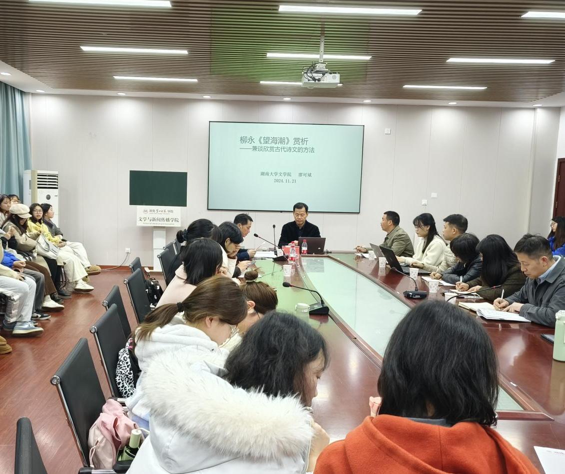 2024年11月21日,湖南大学文学院廖可斌教授应邀来院开展题为“柳永《望海潮》赏析——兼谈欣赏古代诗文的方法”的学术讲座。AV中文字幕在线观看院长龙永干、副院长杨水远,汉语言文学系教师及23级润之英才班全体同学等百余名师生参加了本次讲座。讲座由院长龙永干主持。