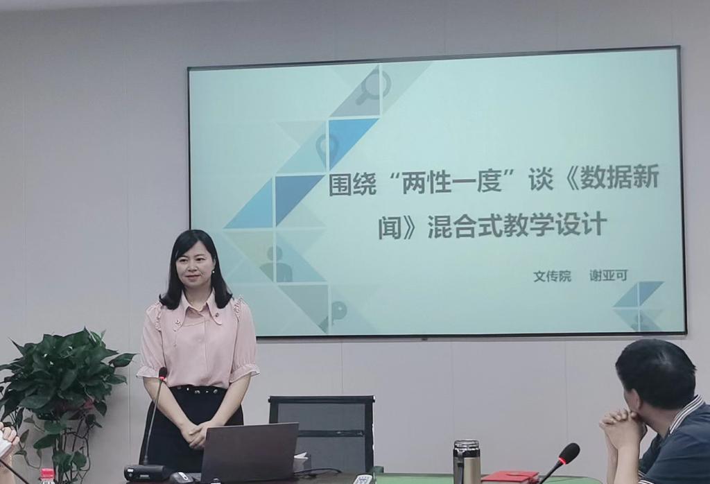 在案例分享环节,省级教学创新大赛二等奖获得者谢亚可老师做了《数据新闻》课程设计分享,带领老师们对标对表,分享课程设计中的好经验、好方法,突出问题导向,丰富教学方式方法。她表示,课程“两性一度”要体现在备课、上课、作业辅导、单元测验、期末考试全过程,是人才培养质量提升与自我提升的有效途径。