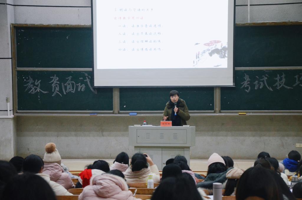 为助力2018级师范生教师资格证面试取得更好的成绩,11月15日,我院诚邀湖南省优秀教师、湖南一师二附小副校长汪春秀在怀中南110报告厅为我院学生做了“小学语文古诗词教学”的专题讲座。副院长葛春蕃主持,2018级全体师范生聆听了本次讲座。