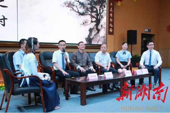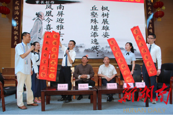 听完课,学校教师代表李伟、张佳晨、吕一帆三位老师,湖南第一师范学院对联基地负责人、湖南省楹联家协会主席鲁晓川、湖南省楹联家协会副主席兼教育委员会主任邹宗德两位专家和1502班学生家长陈铁建一起带来沙龙——“议楹联之雅”,鲁晓川主席还现场为大家讲授对联知识。