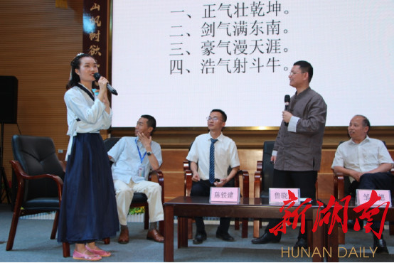 “沐校园之风”是活动的第一个环节。“体仁以长人,一片真情为化雨;守直而成栋,满山枫树欲参天”、“经文纬武同追梦,立志持身勤读书”, 校园里展示的三十多副木刻精品对联,读起来铿锵有致,看起来赏心悦目。赏联、诵联、评联、摩联……人们畅游在优秀楹联文化所营造的氛围中。这些对联是湖南第一师范学院对联基地联合省楹联家协会邀请省内知名专家精心撰制书写的,副副作品都堪称精品。接下来是“研联教之髓”,在湖南第一师范学院对联基地专家指导下,袁一婷老师带来学生们“着汉服,执古礼”,推出了一堂生动的楹联主题教育课《趣识对联》。