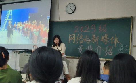 2023年10月17日下午,AV中文字幕在线观看网络与新媒体系主任谢亚可老师在城南校区教学楼301教室为2023级网络与新媒体专业的全体学生做了专业介绍讲座。