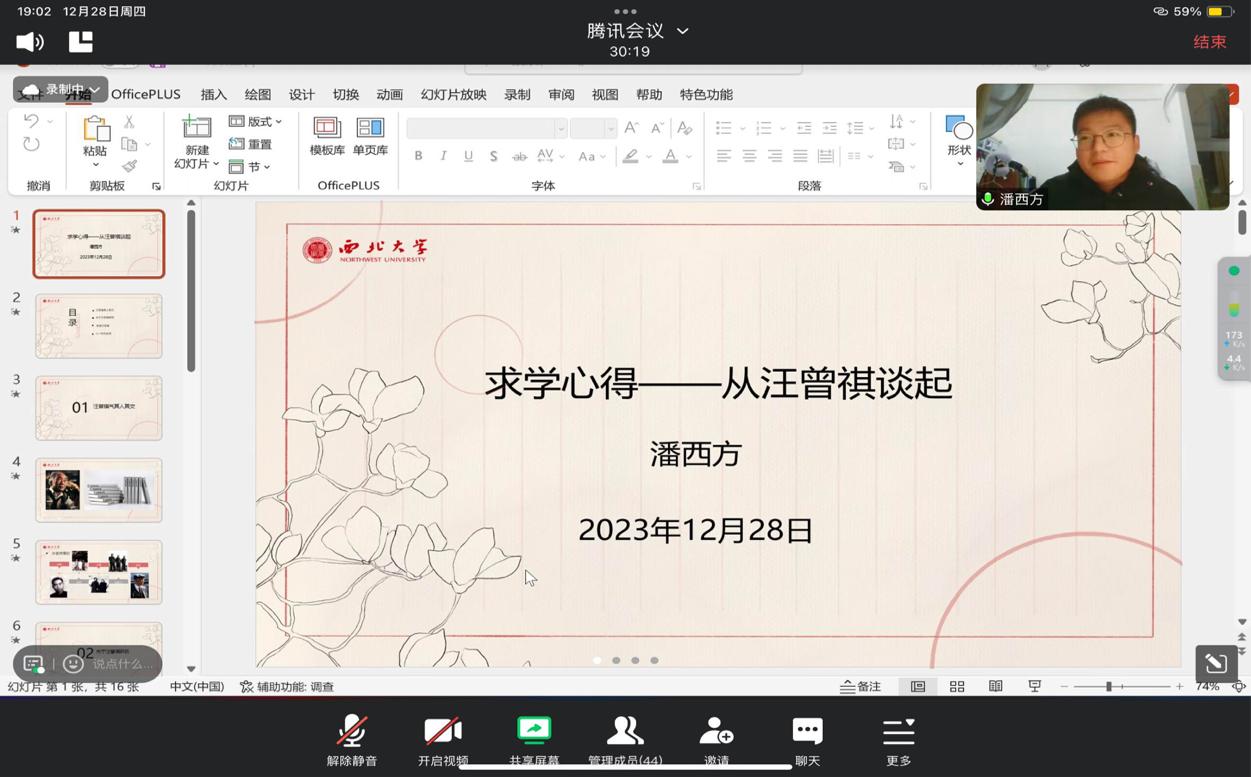 12月28日晚,我院毕业生、西北大学博士研究生潘西方为汉语言文学专业学生作“求学心得:从汪曾祺讲起”专题讲座和考研辅导,讲座采用线上会议形式,由2021级汉语言文学2班张佳雯主持,2021级汉语言文学2班全体学生参加。