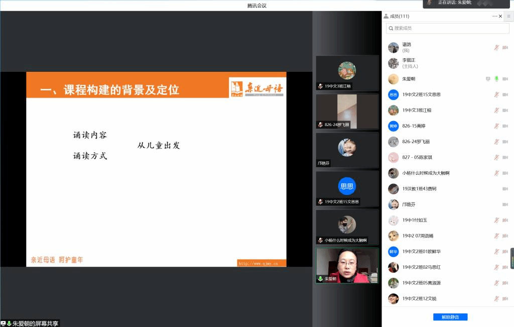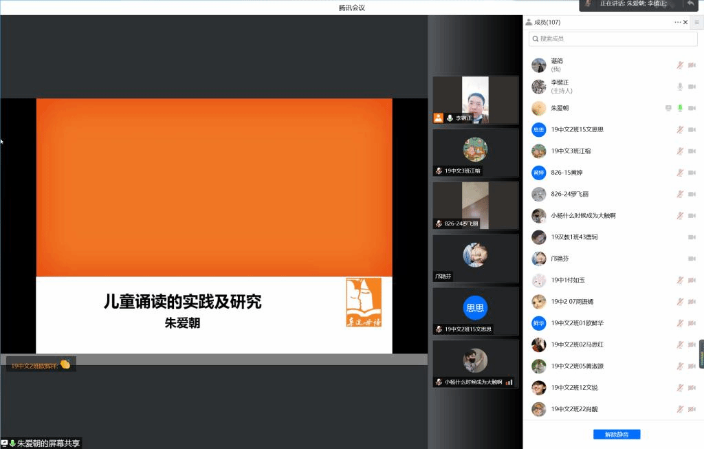 全国优秀教师、长沙市两届小学语文首席名师、芙蓉区育才学校校长朱爱朝为见习生们开展了主题为《儿童诵读的实践及研究》的讲座。朱校长认为对于语文老师而言,表达能力和语言感染力非常重要,而锻炼诵读能力是提高表达能力的重要方式。她结合自身多年的一线小学语文教学经验,从诵读内容和诵读方式两方面指导同学们如何教儿童诵读。期间朱老师结合大量的诵读案例,和同学们进行了充足的互动交流,同学们的积极参与也获得了朱校长的中肯点赞。最后,在朱校长极具感染力的诗词吟诵中,讲座圆满结束。