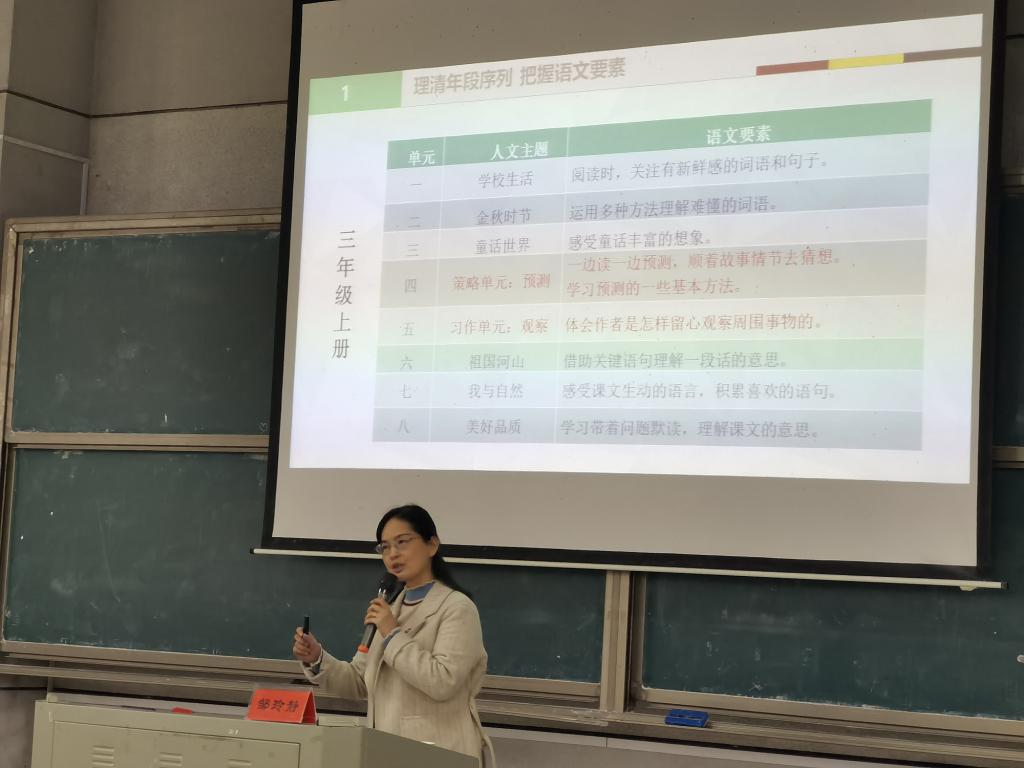 邹老师从简单谈话导入,随机迅速进入正题。邹老师首先跟同学们分享了统编版教材的四点编写思路:双线组织单元,加强单元整合;强化阅读,构建三位一体阅读体系;重视方法指导,促进能力提升;凸现实践性,加强语言文字的运用。由此过渡到讲座的主要问题——我们要怎样用好统编教材,落实语文要素?邹老师从三个方面展开分析:理清年段序列,把握语文要素;细化教学目标,明确教学内容;对比新旧教材,做好有序衔接。邹老师以精炼的语言为载体,从别样的角度分享了运用统编教材,落实好语文要素的经验。