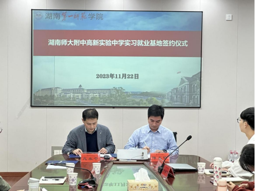 交流指导结束后,我院与湖南师大附中高新实验中学签订实习就业基地协议。陈文锋书记一再鼓励全体师生要不断学习和探索,要具备探索精神,适应时代,学会创新。他希望在座全体同学能够积极投身教育事业,为我国教育事业的成长和未来做出更多的贡献。