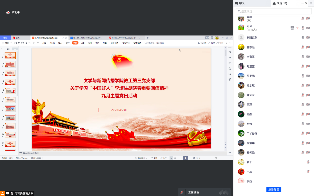 2022年9月20日晚7点,我院教工第三支部以腾讯会议的方式组织开展了9月主题党日活动。本次活动以“学习习近平总书记给‘中国好人’李培生、胡晓光重要回信精神”为主题,活动由支部书记谢亚可同志主持。
