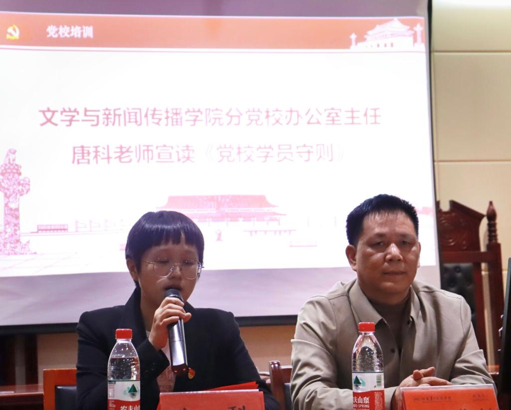 本次开班仪式由党校副校长欧阳范剑同志主持,在庄严的《国际歌》中,本次仪式正式拉开帷幕。仪式的开始,我院分党校校长、党委书记陈天涯同志代表学院党委致辞。陈书记在讲话中提出了三点期望,鼓励学员们要争做心中有坚定信念,脚下有力量、有笃行、有作为的新时代青年。随后,来自20级网媒与新媒体1班的贺晨欣同学代表全体学员发言,表达了她对中国共产党的向往和认真参与本次培训的决心。仪式末尾,我院学生第一党支部书记唐科同志宣读了《党校学员守则》,重点强调了本次培训的纪律与要求,希望全体学员能按照规定严格要求自己。