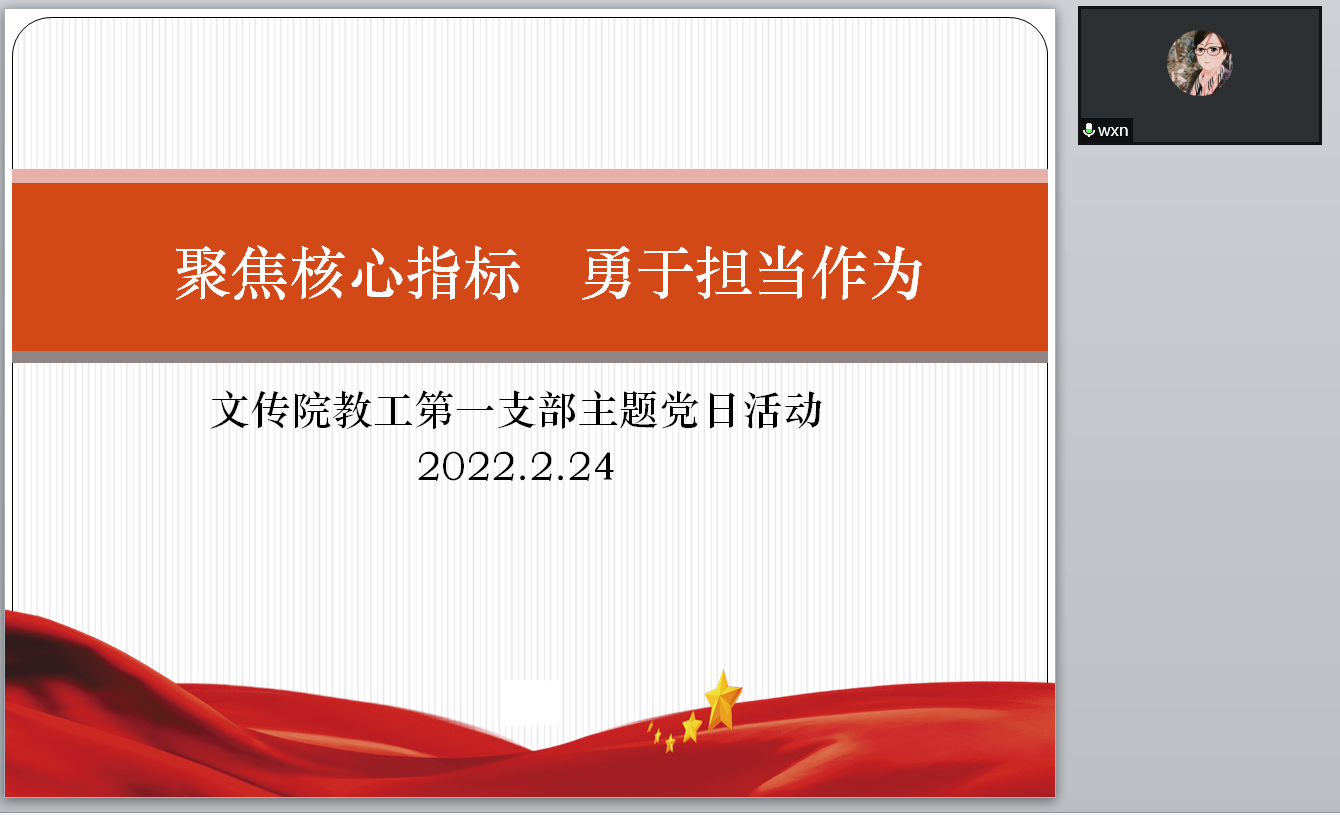 2022年2月24日晚19:00—21:00,文传院教工第一党支部根据学院党委的工作安排,以线上会议的形式开展了“聚焦核心指标,勇于担当作为”的主题党日活动。