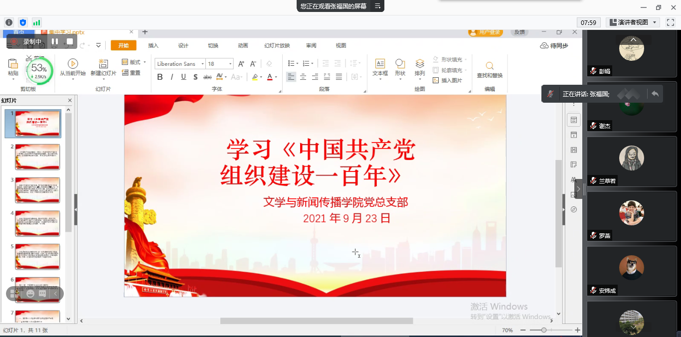 2021年9月25日,AV中文字幕在线观看党总支在腾讯会议(793830152)上召开了党总支集中学习扩大会议,进行《中国共产党组织建设一百年》集中学习讨论。学院党总支委员、党支部书记、院部班子成员参加本次会议,会议由学院党总支书记张福国主持。