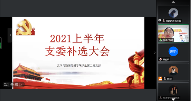 6月18日中午,我院学生第二党支部以线上会议的形式召开了2021上半年学生支委补选大会。本次会议由学生第二党支部书记安炜成老师主持,支部全体党员参加。
