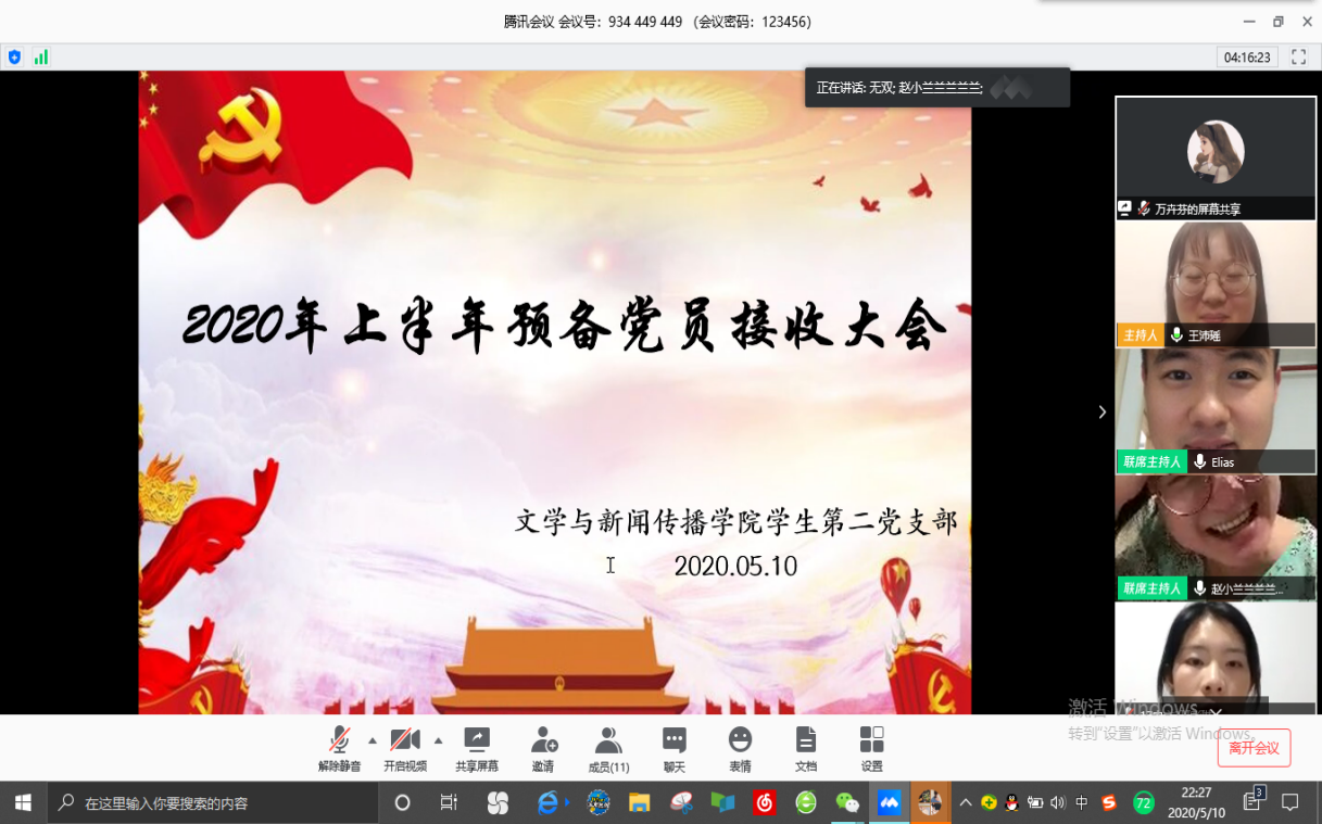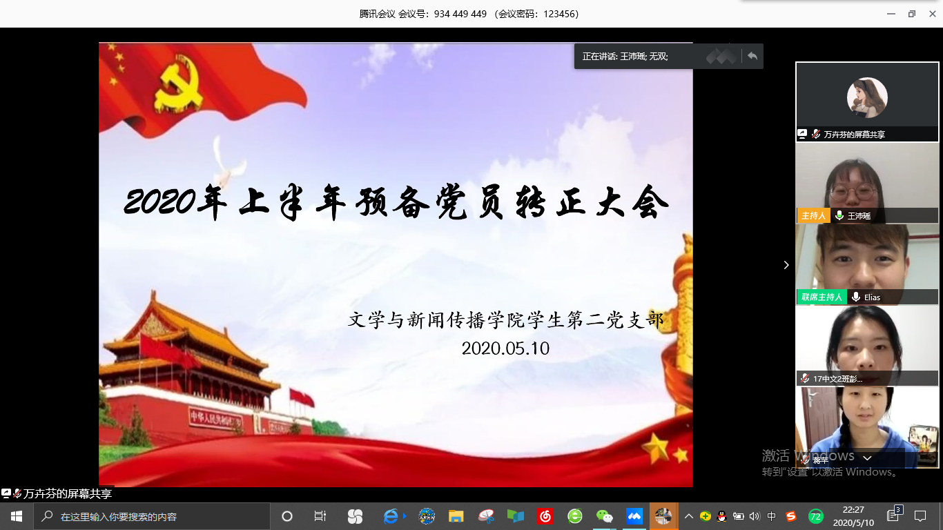 2020年5月10日,AV中文字幕在线观看学生第二党支部以线上会议的形式召开了预备党员接收及预备党员转正大会。学生第二党支部书记安炜成老师、副书记赵雅兰老师、学生第二党支部全体学生党员和本批次的发展对象参加会议。安炜成老师主持本次会议。