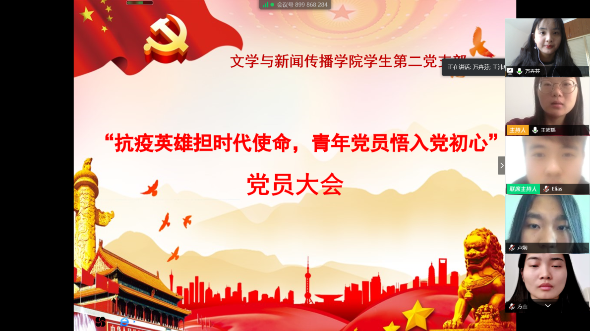 2020年4月13日晚上7:00,为了学习抗疫英雄的伟大事迹,提高青年党员的使命意识,发挥先锋模范作用,我院学生第二党支部通过腾讯会议召开“抗疫英雄担时代使命,青年党员悟入党初心”党员大会。学生第二党支部书记安炜成老师,副书记赵雅兰老师,以及学生第二党支部全体学生党员参加此次大会,大会由安炜成老师主持。