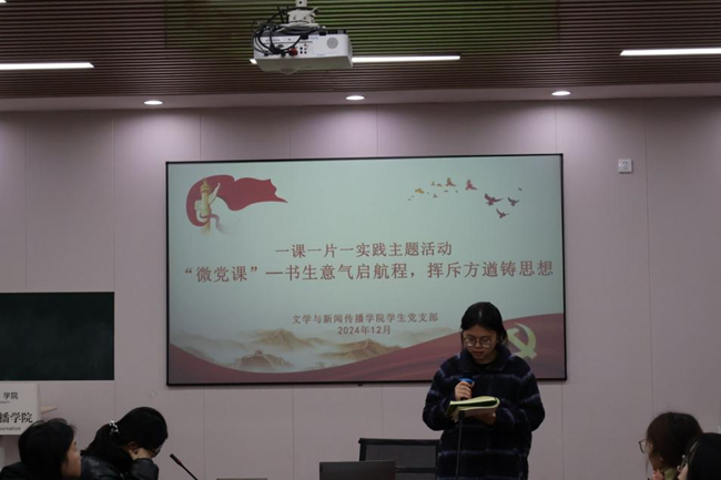 为进一步丰富党员教育形式,增强党员教育实效,提升学生党员的思想觉悟和政治素养,12月11日中午,我院学生党支部在玉衡楼201开展“书生意气启航程,挥斥方遒铸思想”的主题党日活动。学生第一党支部副书记陈滢琪出席,全体在校学生党员与会。