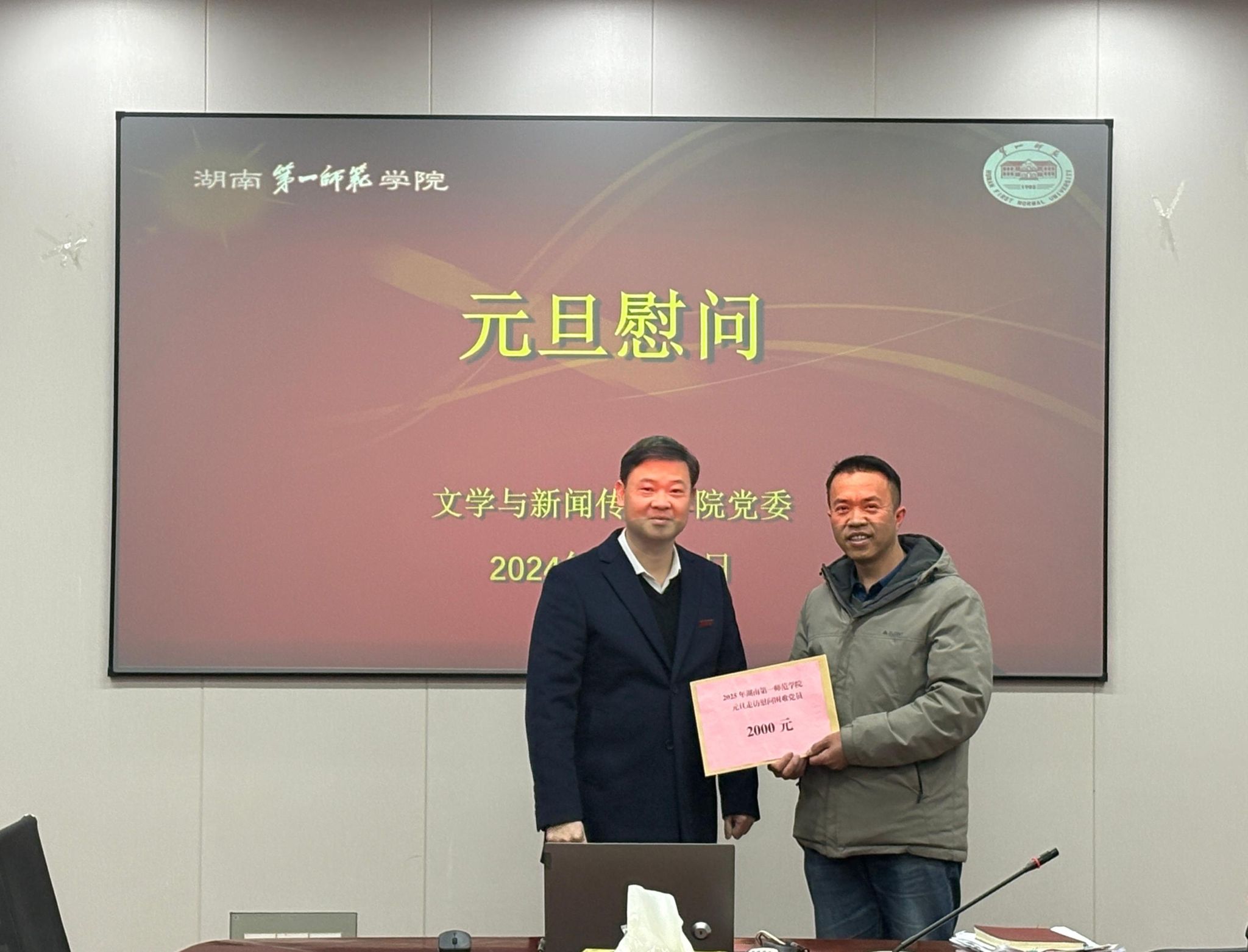 值此元旦佳节即将来临之际,2024年12月26日,全体学院党委委员受学校党委之托,代表组织向困难党员李锴正同志致以新年的祝福,并送上慰问金,表达党组织的关怀与温暖。