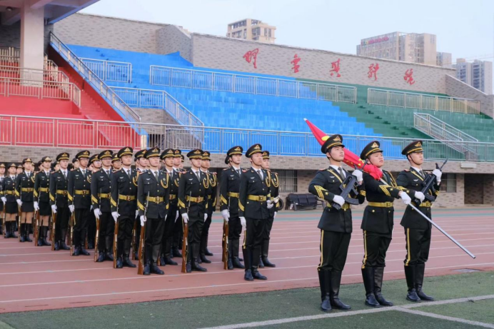 清晨七点整,国旗仪仗队队员们迈着坚定有力的步伐,拥簇着五星红旗来到旗杆下。随着激昂的《义勇军进行曲》奏响,全体师生面向冉冉升起的国旗肃立致礼、齐唱国歌。
