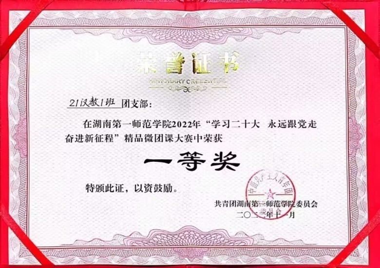 11月25日,由我院推选的2021级汉语国际教育1班团支部在学校举办的“学习二十大 永远跟党走 奋进新征程”精品微团课大赛决赛中表现优异,荣获一等奖!特向全院师生报喜!