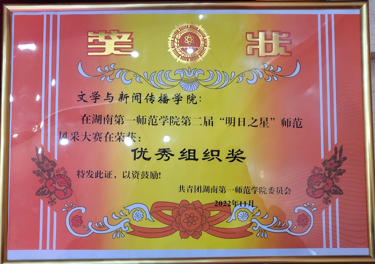 在10月学校举行的省级参赛选手选拔中,19级800中文班何婉源脱颖而出,将代表学校参加12月9日举行的2022年湖南省普通高校师范生教学技能竞赛。学院组织得力、成绩突出,获得“优秀组织奖”!特向全院师生报喜!