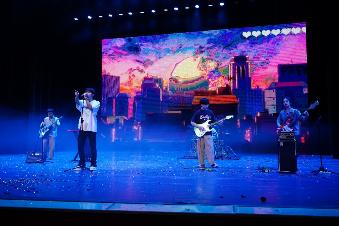 晚会第三篇章“月·咫尺天涯情谊载”首先呈现的是由氧化钙乐队带来的歌曲《枫林夏日限定》,歌声里尽显少年意气。