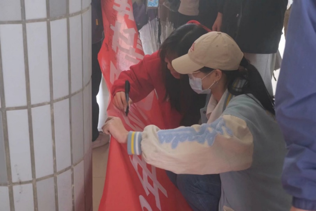 讲座结束后,大家在周教官的指挥下进行了应急疏散演练。随着紧急警报的响起,全体学生迅速用衣袖捂住口鼻,降低重心弯腰前行,冷静快速地按照规定的逃生路线从教学楼的安全出口有序撤离至场外空地。在演练过程中,各位教师也迅速到岗,在教室和教学楼的出口指导同学有序撤离,并在疏散后及时整队清点人员。疏散过后,周琪教官对本次演练活动进行评价与总结,肯定了全体师生在演练中做到了快而不乱,快中有序。演练结束后,参与师生一同在横幅签字,并合影留念。