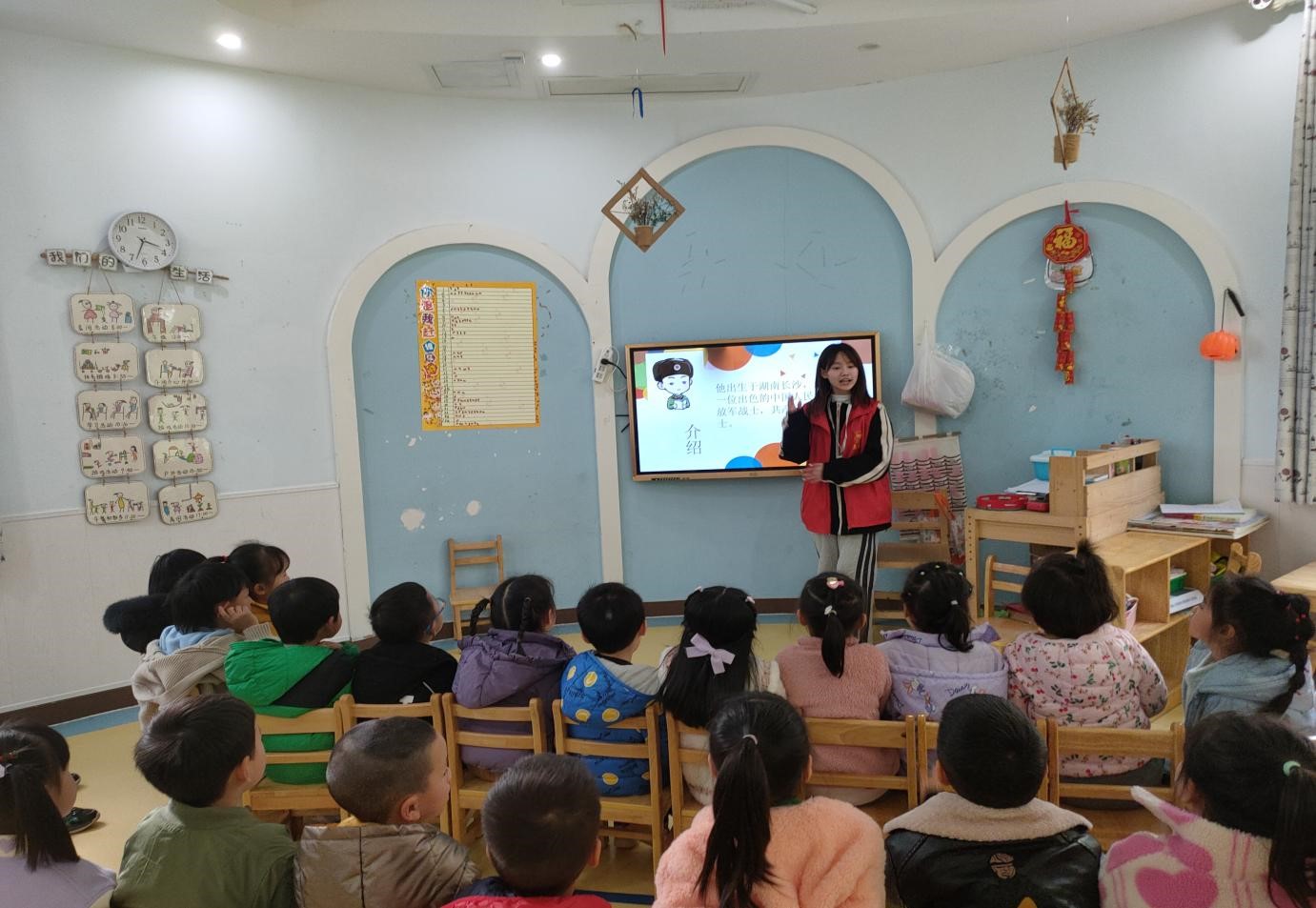 “学习雷锋好榜样······”合唱形式的导入吸引了大班小朋友的注意力,“小朋友们知不知道雷锋叔叔是谁呀?”志愿者老师紧接着抛出的问题在大花小花幼儿园大班的小朋友中激起了圈圈涟漪,他们高高举起手臂踊跃地回答,描述着自己心里的“雷锋叔叔”,共同拼接着鲜活的“雷锋叔叔”的形象。