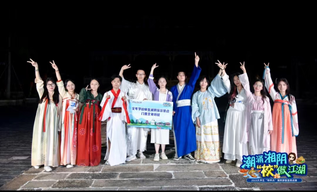 青春力量,潮涌湘阴。8月13日—18日,湖南省岳阳市湘阴县举办2023年大学生“特种兵”湘阴游盲盒挑战赛,此次比赛特邀自武汉大学、中南大学、湖南大学、湖南师范大学、湖南第一师范学院等11所高校共100余名学生参加。我校学生组团参与本次挑战赛。经过激烈角逐,荣获团体第三名,为全校师生赢得全年湘阴旅游景点门票全免特权。团队共11人,其中8名学生来自文传院。