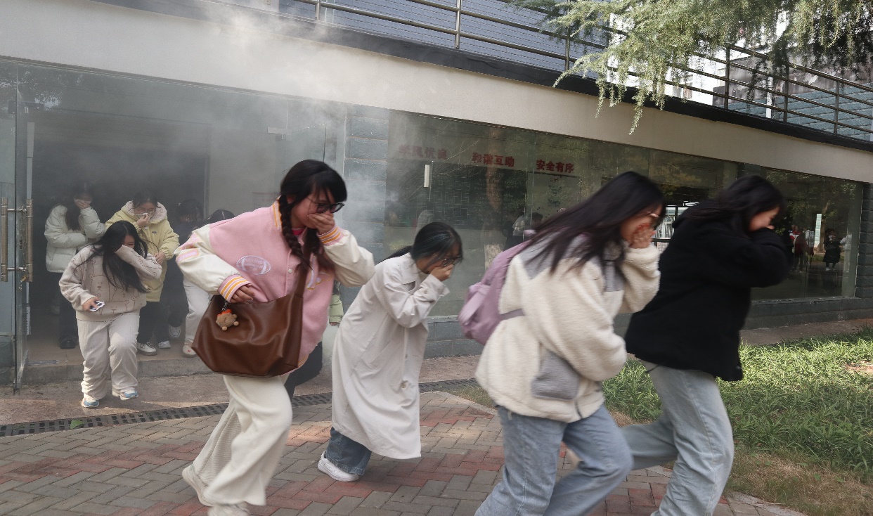 12时30分,同学们在周洋教官的指挥下进行应急疏散演练。随着警报响起,寝室楼道内弥漫着烟雾,消防演练正式开始。全体学生迅速用衣袖捂住口鼻,降低重心弯腰前行,冷静快速地按照规定的逃生路线从寝室的安全出口有序撤离至国基广场。在演练过程中,辅导员老师在寝室的安全出口指挥同学们有序撤离,并在疏散后及时整队清点人员。