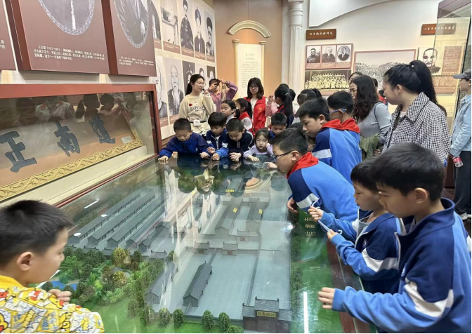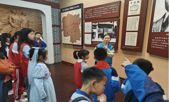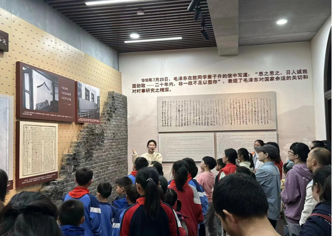 由宏伟的大礼堂到各个红色文化展厅,从八班教室、八班寝舍到冷水浴古井,志愿者们精神饱满,引导家长和小朋友们逐一参观,并耐心、详细地讲述着红色文物背后的历史故事。当志愿者讲述毛泽东一年四季洗冷水浴的故事时,小朋友们在两棵挺立的石榴树下,好奇地上前探头查看古井,感叹毛爷爷坚强的意志。参观结束后,志愿者们通过知识问答、“送鸡毛信”游戏等带领小朋友们重温一师红色经典故事。小朋友们三五成组,表演了抗战小英雄“海娃”为八路军送信的片段,在历史“剪影”中演绎了红色革命文化伟力。寓教于乐、融学于趣的形式让小朋友们兴致满满、流连忘返。