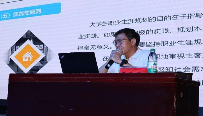 在讲座中,李豪杰以其丰富的职业指导经验和生动的案例为同学们解答疑惑。他指出,大学生要拥有职业意识,从而树立正确的职业理想,利用职业目标的‘导向、推动、激励’作用督促自己不断进步,达到理想职业的彼岸。“我是谁”需要大学生通过自我反省、他人评价获得兴趣与个性上职业认知;“我要成为什么”则需要同学们对职业世界进行探索从而进行自我与职业的匹配;“我该怎么做”则需要从大一开始树立职业理想的同时,合理规划学业、正确管理时间、提升职业素养。
