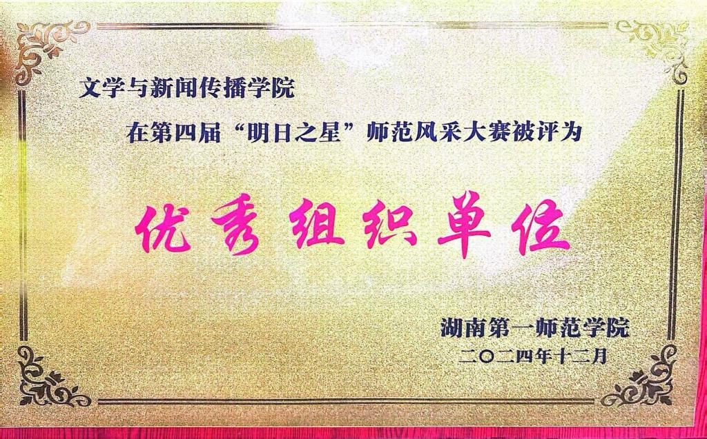 12月10日下午,湖南第一师范学院在田汉剧场隆重举办第四届“明日之星”师范风采大赛成果展暨颁奖典礼,我院凭借出色的组织工作和选手们的优异表现荣获第四届“明日之星”师范风采大赛“优秀组织奖”!