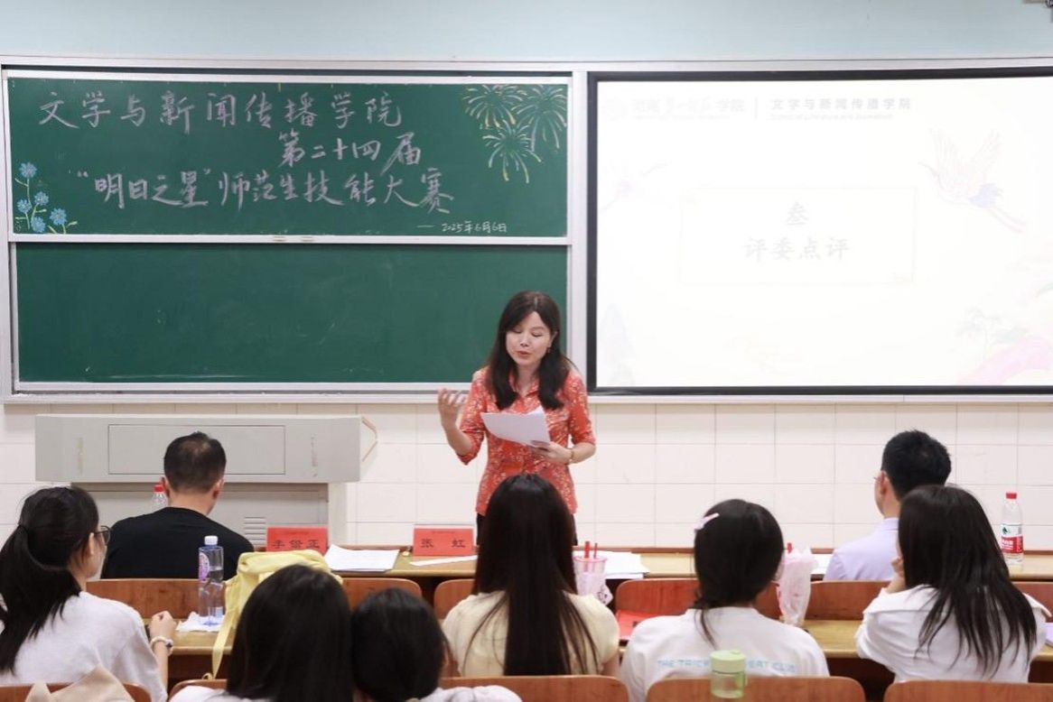 为全面提升师范生教学技能与专业素养,增强教学实践能力,历经班级初赛、学院复赛,6月6日晚我院第二十四届“明日之星”师范生教师技能大赛在怀中南105教室举行,12名选手脱颖而出,同台竞赛。AV中文字幕在线观看综合教研室主任张虹,副主任李锴正,汉语言文学系教师童业富担任评委,2022-2024级100余名师范专业学生现场观摩学习。