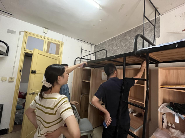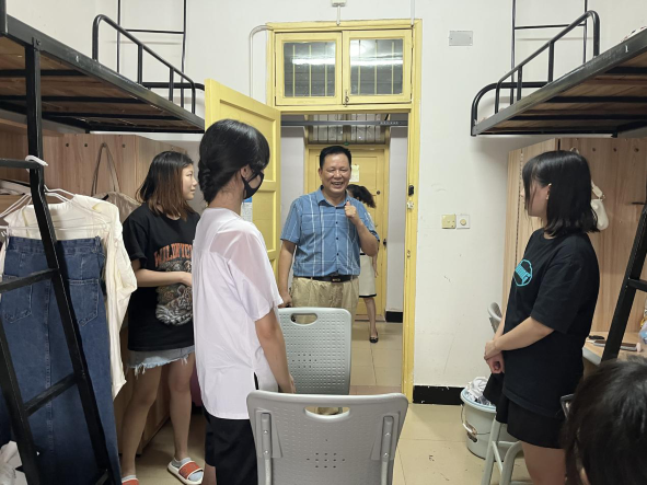 8月27日下午,我院欧阳范剑副书记带领全体辅导员,进入学生公寓,排查寝室安全隐患,记录寝室空调漏水、椅子缺失、墙壁污损等情况,并及时上报,主动为学生排忧解难。