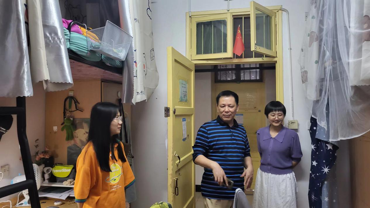6月13日下午,我院党委副书记欧阳范剑、学工办主任唐科、辅导员熊薇来到学生宿舍8栋,走访了重点关注学生的寝室,跟进了解其学习生活现状,鼓励同学们努力学习,扎实备战期末考试。