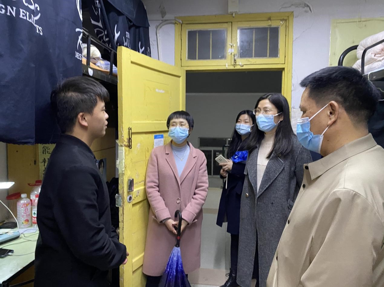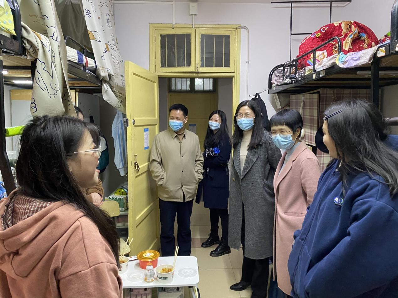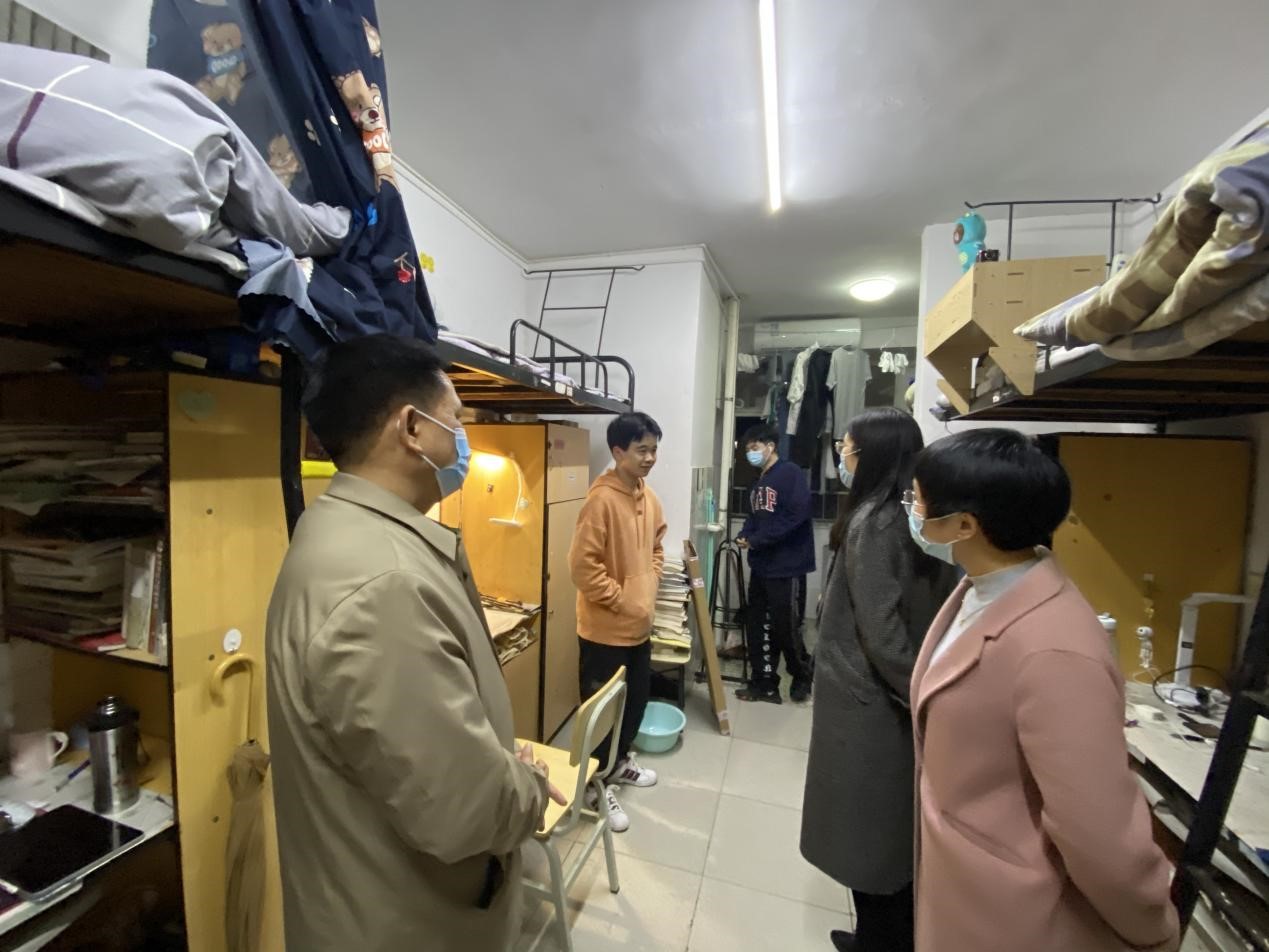 4月16日晚,校党委委员、副校长蒋蓉,学工部老师颜雅琴,我院党委副书记欧阳范剑,学工办主任唐科与值班辅导员刘晨晨走访学生公寓,为疫情常态化生活中的同学们送去关怀与温暖。