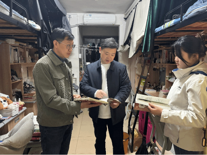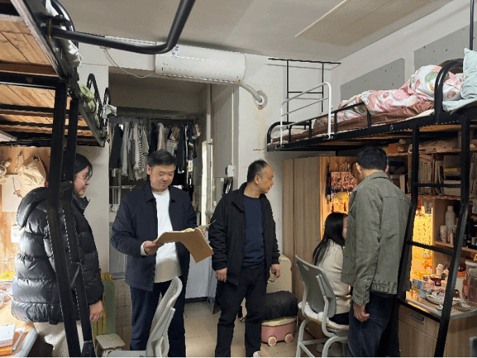 走访过程中,刘立勇书记一行重点检查了寝室卫生环境及公共设施运行情况,对消防通道、用电安全进行安全隐患排查。“宿舍既是生活空间也是成长阵地,要把安全规范放在首位。”刘书记在发现个别宿舍存在插线板过载现象时,现场示范标准化用电方案,要求辅导员建立“问题宿舍”跟踪整改台账。公寓专干老师同步指导床铺整理、物品收纳等内务规范,推动宿舍标准化建设。