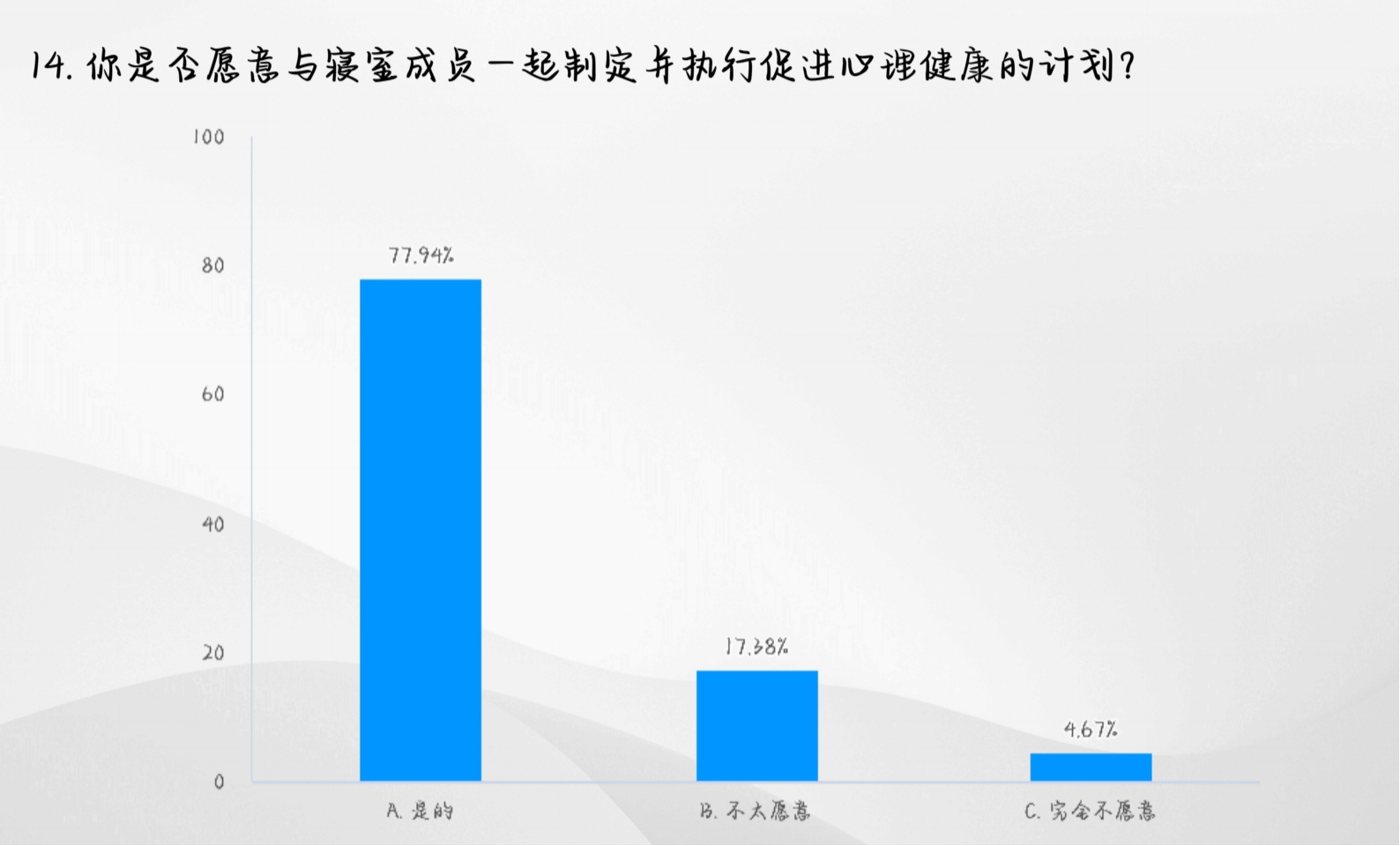 寝缘心聚,携手并进。5月14日-5月20日。我院举办了“寝缘心聚 携手并进”线上问卷活动,以加强寝室长对室友的了解,增强了同学们的心理健康意识为目标,提升寝室成员间的情感联系,构建和谐寝室关系。通过对问卷数据的分析,为我院后续的心理健康教育提供有针对性的建议。
