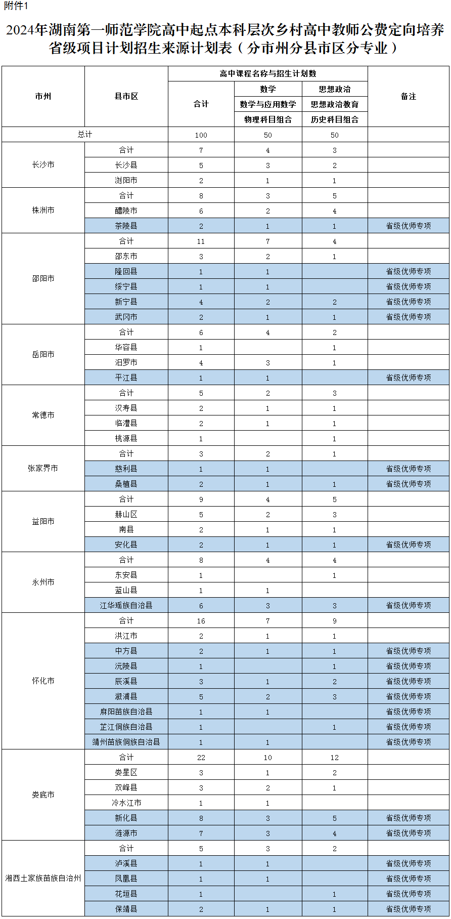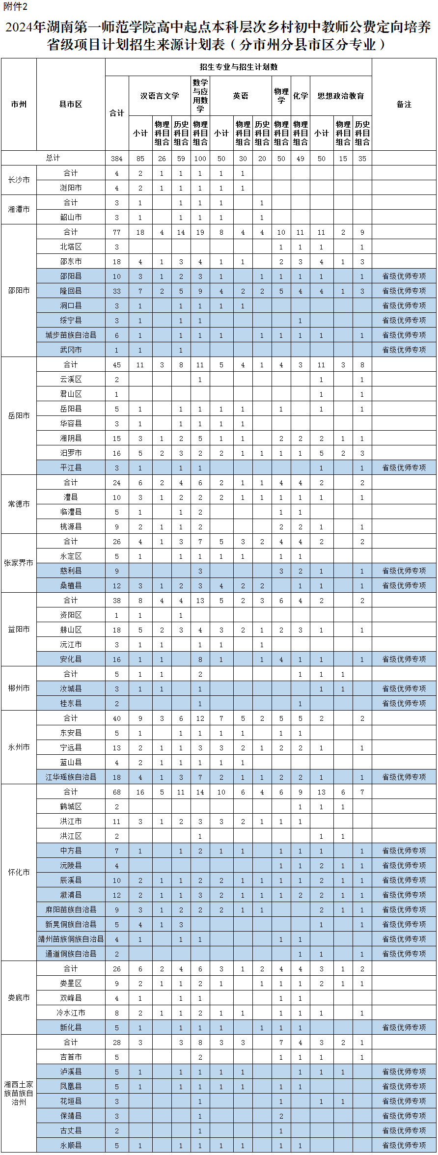 附件:1. 2024年湖南第一师范学院高中起点本科层次乡村高中教师公费定向培养省级项目计划招生来源计划表(分市州分县市区分专业)