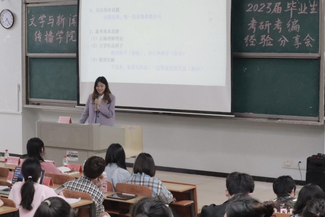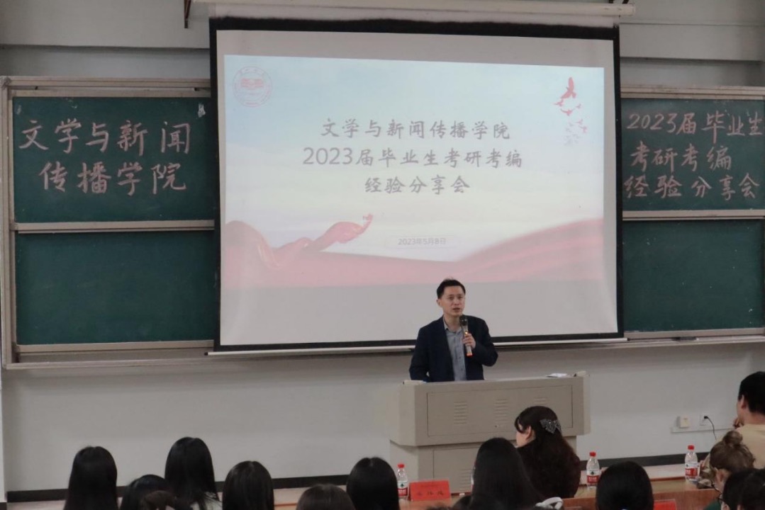 为不断提高人才培养质量,5月8日晚,我院在怀中南209教室召开了2023届毕业生考研考编经验分享会。院长龙永干、副院长王霞、学工办副主任曾志远、辅导员刘晨晨,以及罗许诺、陈敏等8名19级学生代表及20级200多名学生参加了本次分享会。