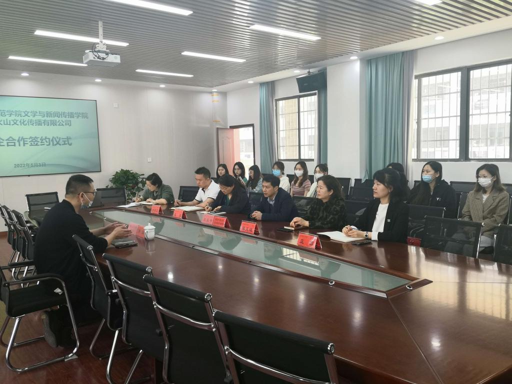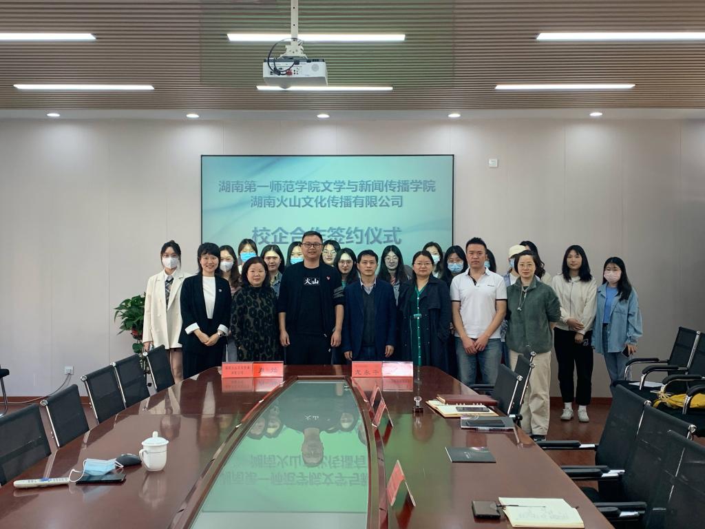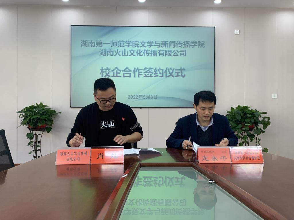 5月2日上午,我院邀请湖南火山文化传播有限公司创始人、董事长肖灿来我院签署校企合作协议。会议由院长龙永干主持,院党委书记陈天涯、副院长王霞、教科办主任李希光、广播电视学系教师庄园以及学生代表参加了本次会议。