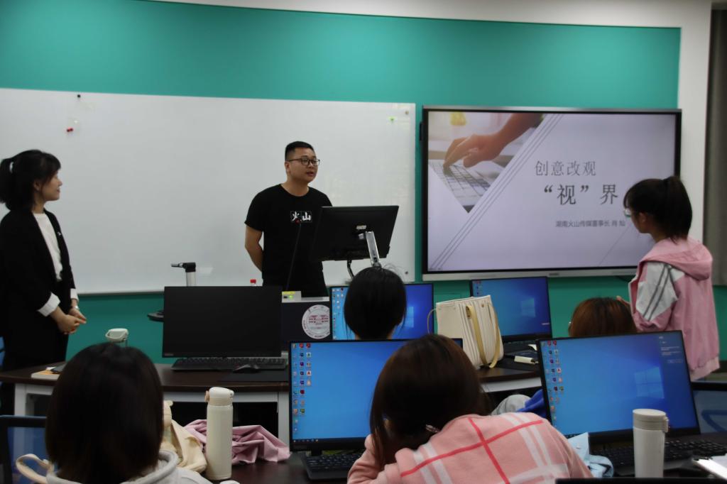 仪式结束之后,董事长肖灿应邀为我院网络与新媒体系师生带来了题为《创意改变“视”界》的学术讲座。肖灿董事长结合自己的创业经历,具体的实践案例,讲授了当下市场最通行的“对比法”“排比法”“拟人法”等广告创意方法,并传授了如何写好文案、如何控制预算、如何与甲方沟通等实用广告技巧。讲座最后,肖灿董事长鼓励同学走出校门,积极实习,练就真本领,早日成为市场所需的合格人才。