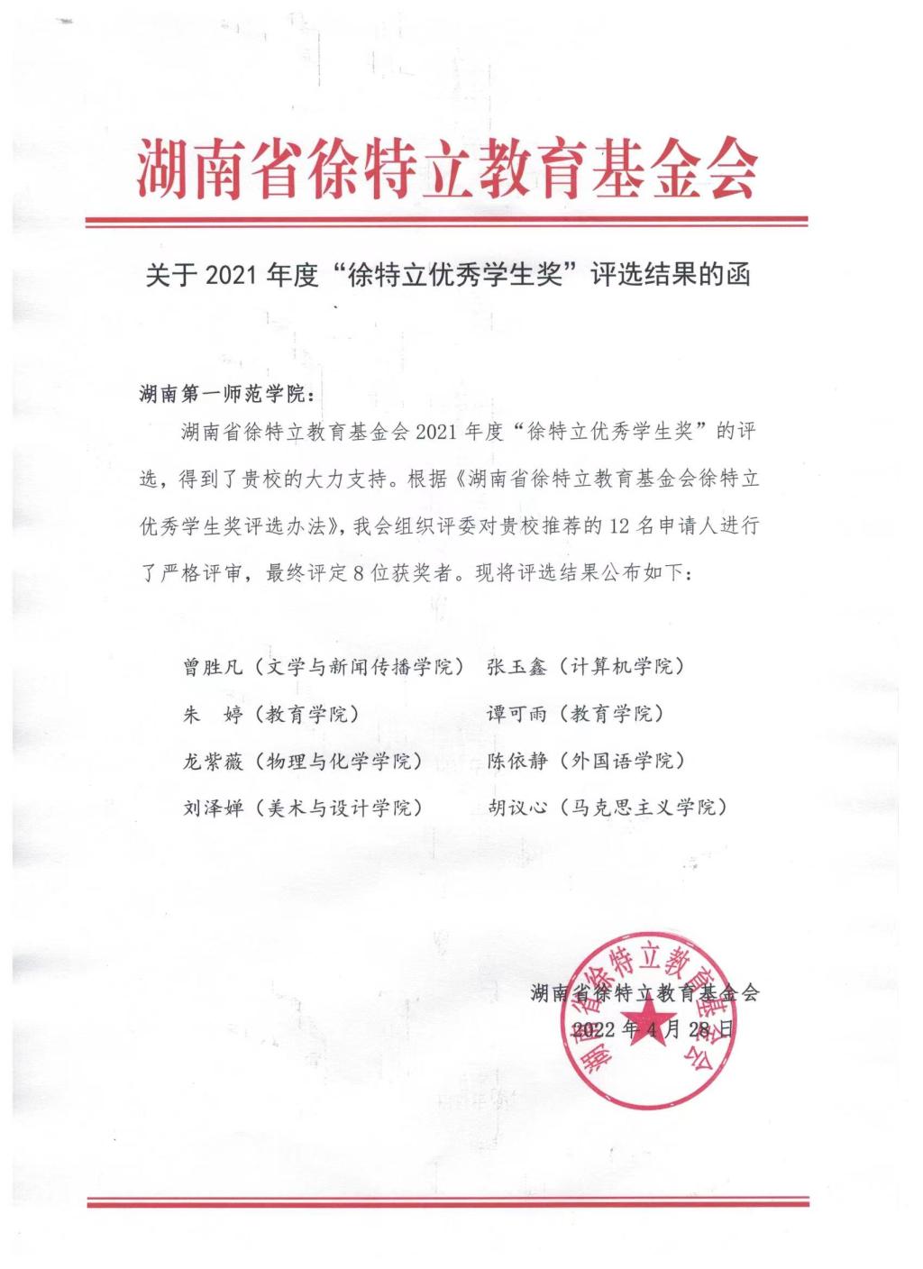 近日,湖南省徐特立基金会公布了2021年度“徐特立优秀学生奖”获奖学生名单,AV中文字幕在线观看曾胜凡同学荣获2021年度“徐特立优秀学生奖”。