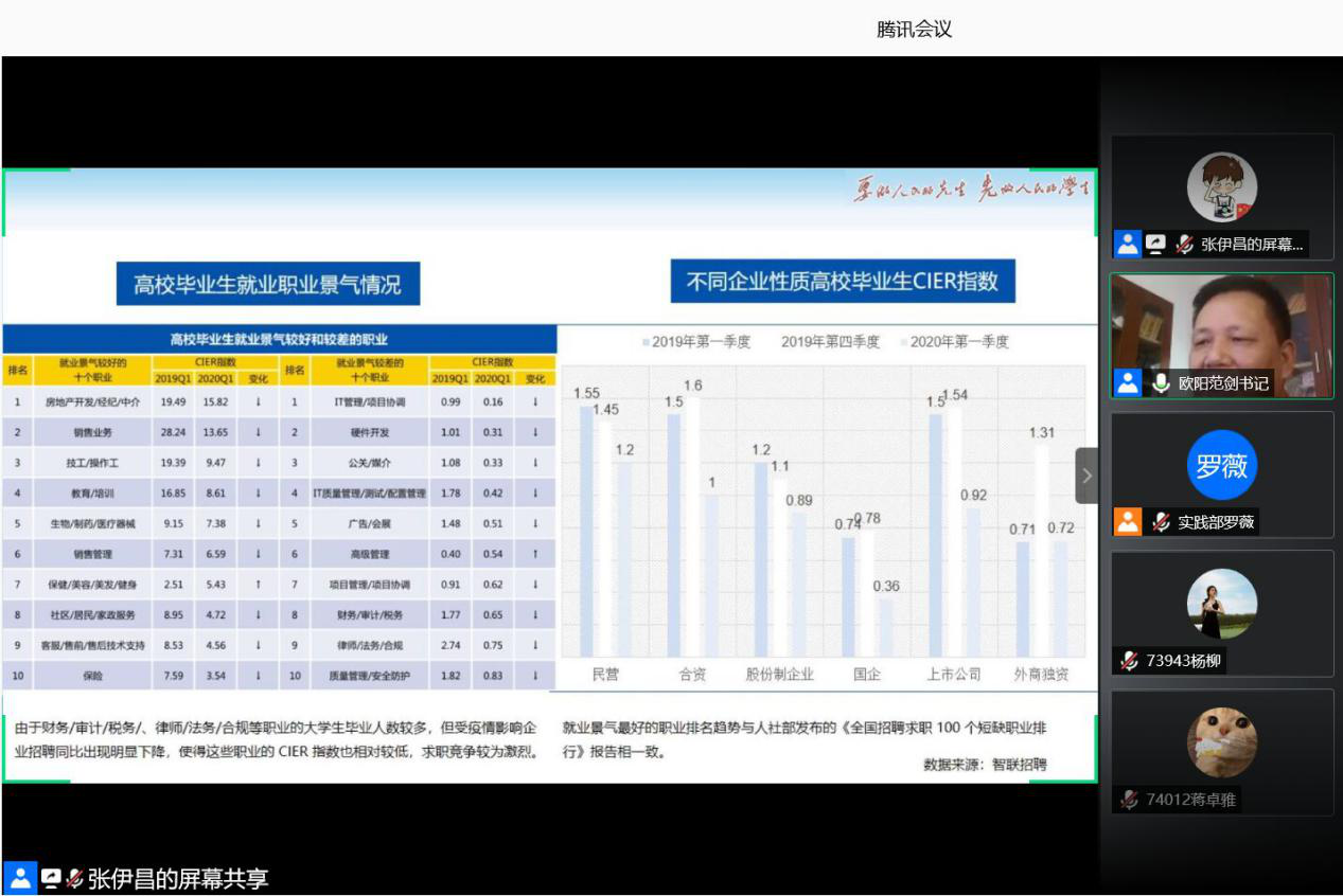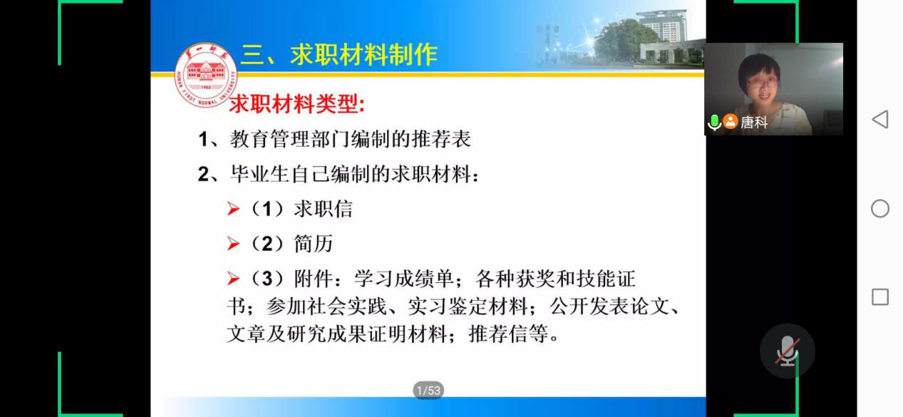 为推动2017级学生了解就业形势与政策,提升学生就业意识、知识与技能,帮助与引导学生增强就业竞争力,7月20日至21日,我院针对2017级学生举行为期两天的线上就业指导课。学院党总支副书记欧阳范剑、学工办主任唐科、就业专干赵雅兰分别为学生们讲授了以“就业形势与政策”“就业定位与准备”“求职面试与签约”为主题的就业指导课,引导学生们做好求职准备。